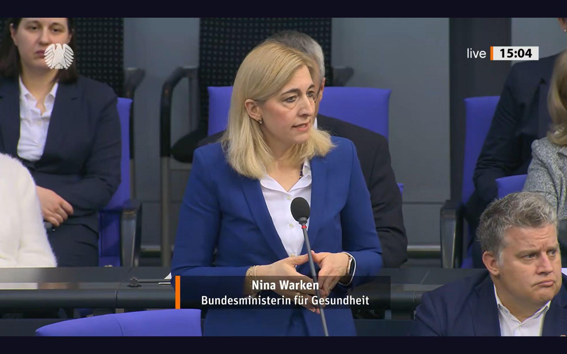 Foto: Screenshot Parlamentsfernsehen • Lizenz: CC-BY •Warken machte klar, dass nicht jedem Fall in der gesundheitlichen Versorgung "mit ärztlicher Zeit begegnet" werden müsse. Stattdessen brauche es einen breiteren Teamansatz. Neben Apotheken und Pflegeberufen nannte sie ausdrücklich „Physiotherapeuten mit einem Direktzugang“. Damit steht das Thema erstmals in dieser Klarheit im parlamentarischen Raum.