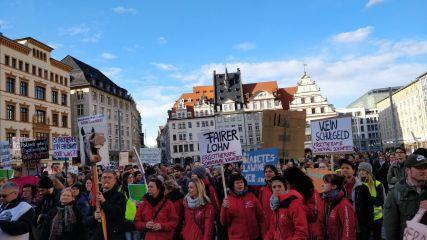 Vorher hatte sich der Demonstrationszug bei widrigsten Bedingungen an der geschichtsträchtigen Nikolaikirche getroffen, um anschließend eine Stunde lang unter lautem Pfeifen und Sirenengeheul durch die Innenstadt zu ziehen.